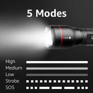 High(300 lumen), Medium(140 lumen), Low(80 lumen), Flash, SOS