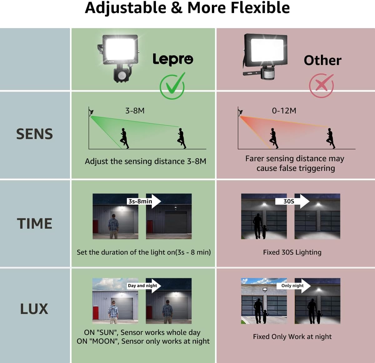 The unique optical design, made of fine-grain tempered glass, the security lights outdoor motion sensor is softer with less glare, safer to use, giving you a more advanced optical experience.