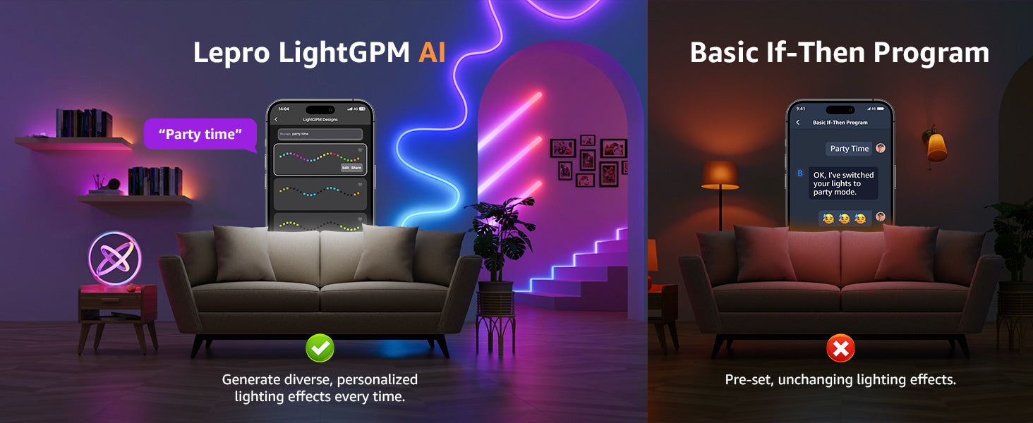 Watch all your Lepro AI smart lights simultaneously sync and dance along to your music or audio, creating a unique sound-to-light, immersive and multi-sensory experience.