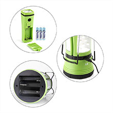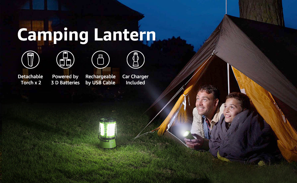 - The main lantern can either be charged via USB or powered by 3pcs D batteries (not included).