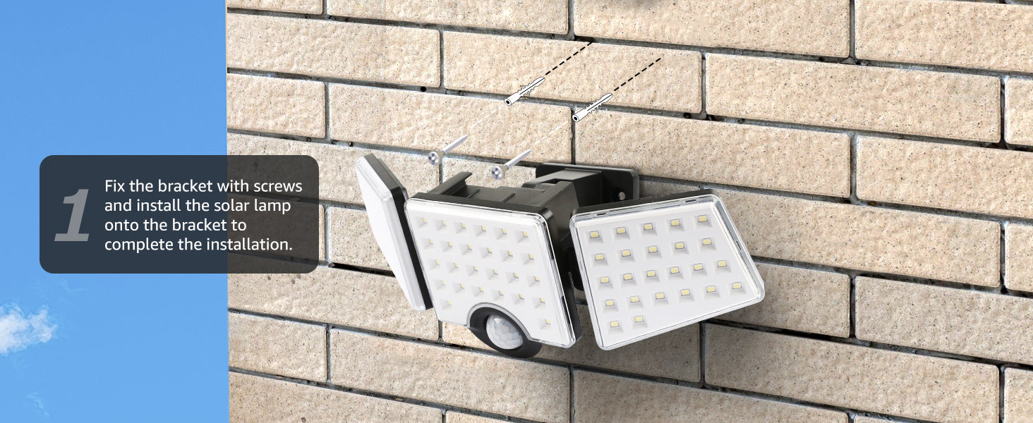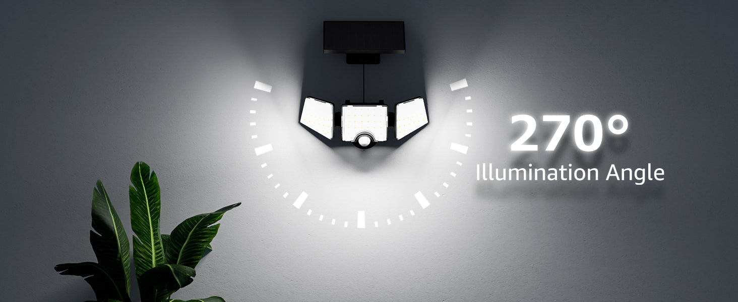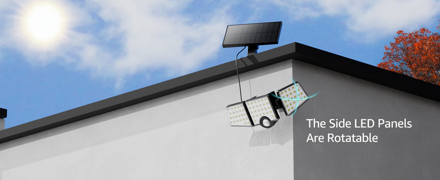 - [1200LM Brightness & 360°Rotable Panels] The solar security lights outdoor motion sensor is equipped with 72 LED lamp beads and 3 rotatable lamp heads. The lighting angle of up to 270° can provide brighter and more extensive outdoor solar lighting for your house.