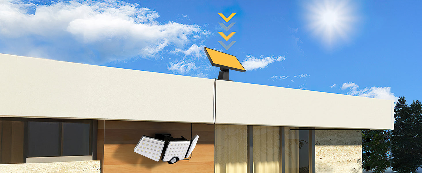 - [Upgraded Solar Security Lights Outdoor Motion Sensor] Compared with traditional solar lights, our solar panels and lights adopt unique split design, which connects by a 4.8M long cable. You can choose a sunny location for solar panel to avoid affecting the solar energy absorption efficiency due to shading by trees and eaves. It can charge and work normally even in rainy season or winter.